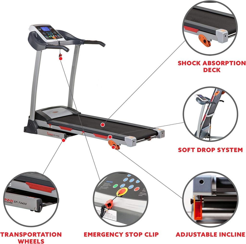 For a home gym, the Sunny Health & Fitness Treadmill has all of the standard features of a lot of treadmills, but at a much lower consumer-conscious price. The soft drop