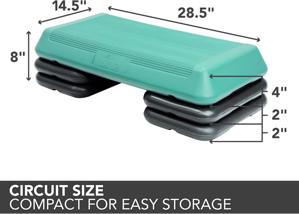 - Four 14.5” L x 9.5”W x 2” H risers allow you to increase the intensity of your aerobic and strength training workouts quickly by adjusting your step height to 4”, 6” and 8” to burn more calories and add the range of motion during your session.