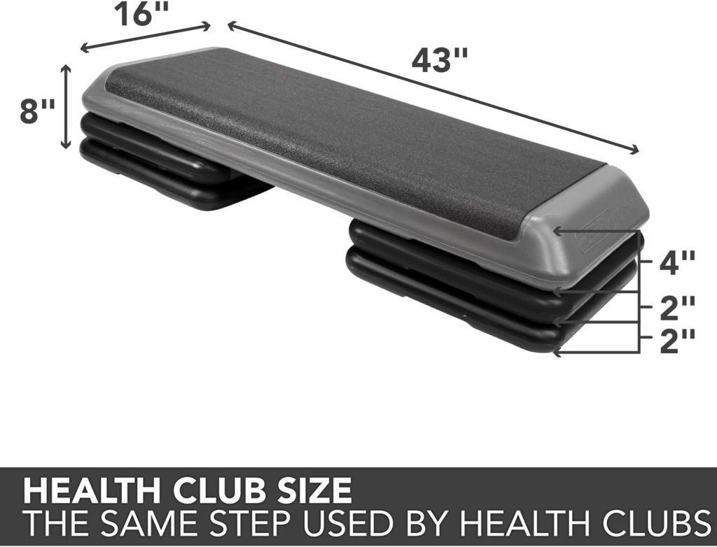 The Original Health Club Step is the perfect health club size aerobic fitness step for home use. This step is perfect for people who want to have the same kind of aerobic step capabilities available in the best fitness clubs. Besides size, the platform comes with a premium cushion-top, teal non-slip platform, 4 original risers as well as an instructional DVD that gives users a perfect workout program foundation.